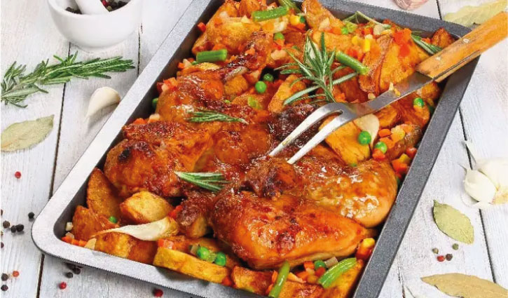 - Place the baking dish in the preheated oven. Roast for about 45-50 minutes or until the chicken is cooked through and the vegetables are tender. You can check if the chicken is done by using a meat thermometer. The internal temperature should reach 75°C (165°F).